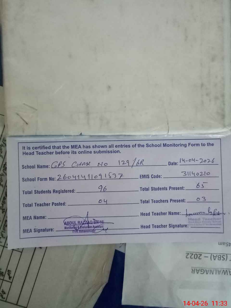 | Attendance Register | Head Teacher | MEA with School | Visit Proof |