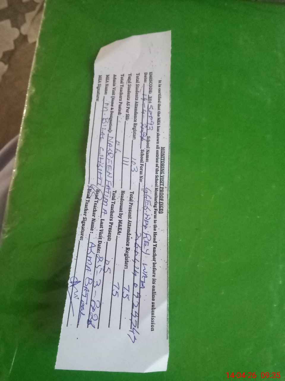| Attendance Register | Head Teacher | MEA with School | Visit Proof |