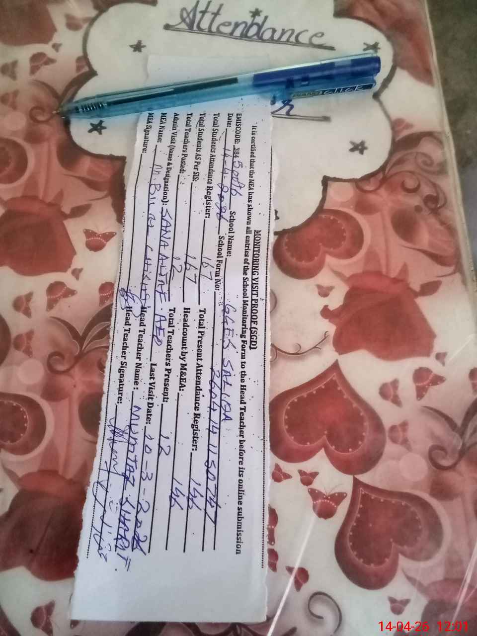 | Attendance Register | Head Teacher | MEA with School | Visit Proof |