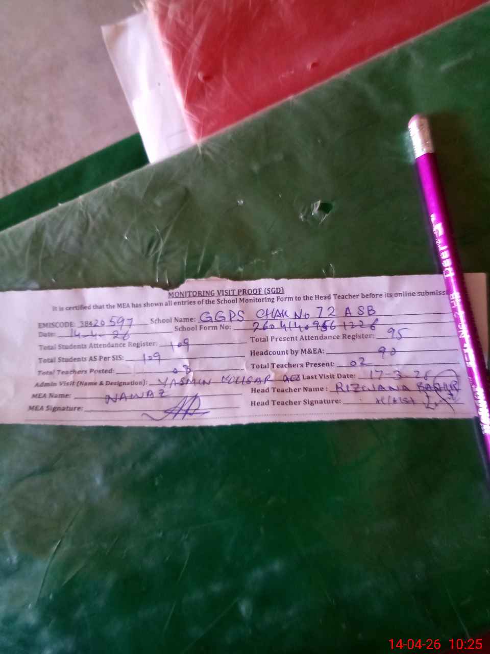 | EMIS Code: 38420597 | Name of School: GGPS CHAK NO.72 A-SB | |||