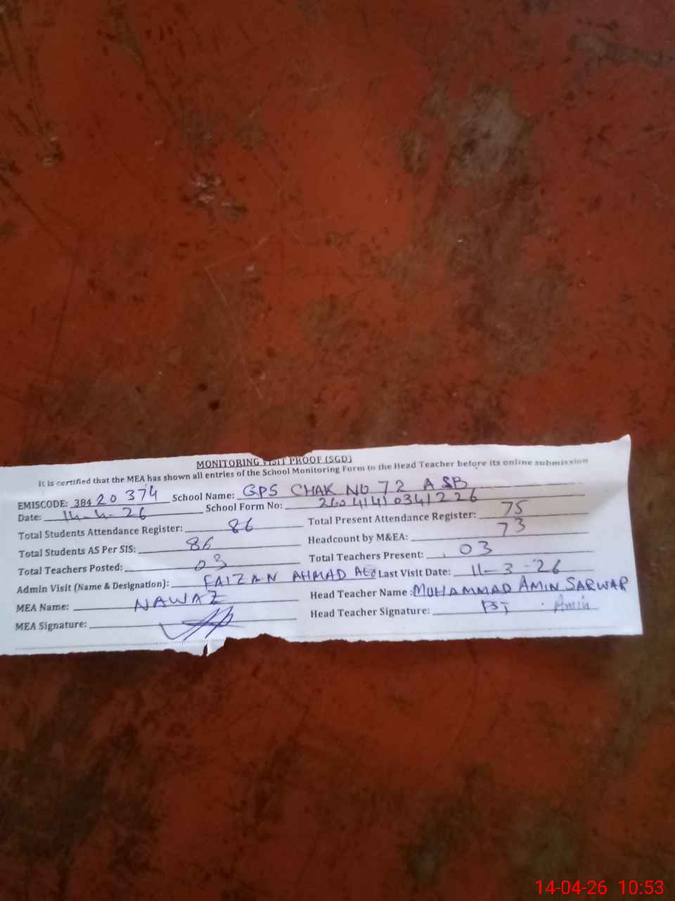 | Attendance Register | Head Teacher | MEA with School | Visit Proof |