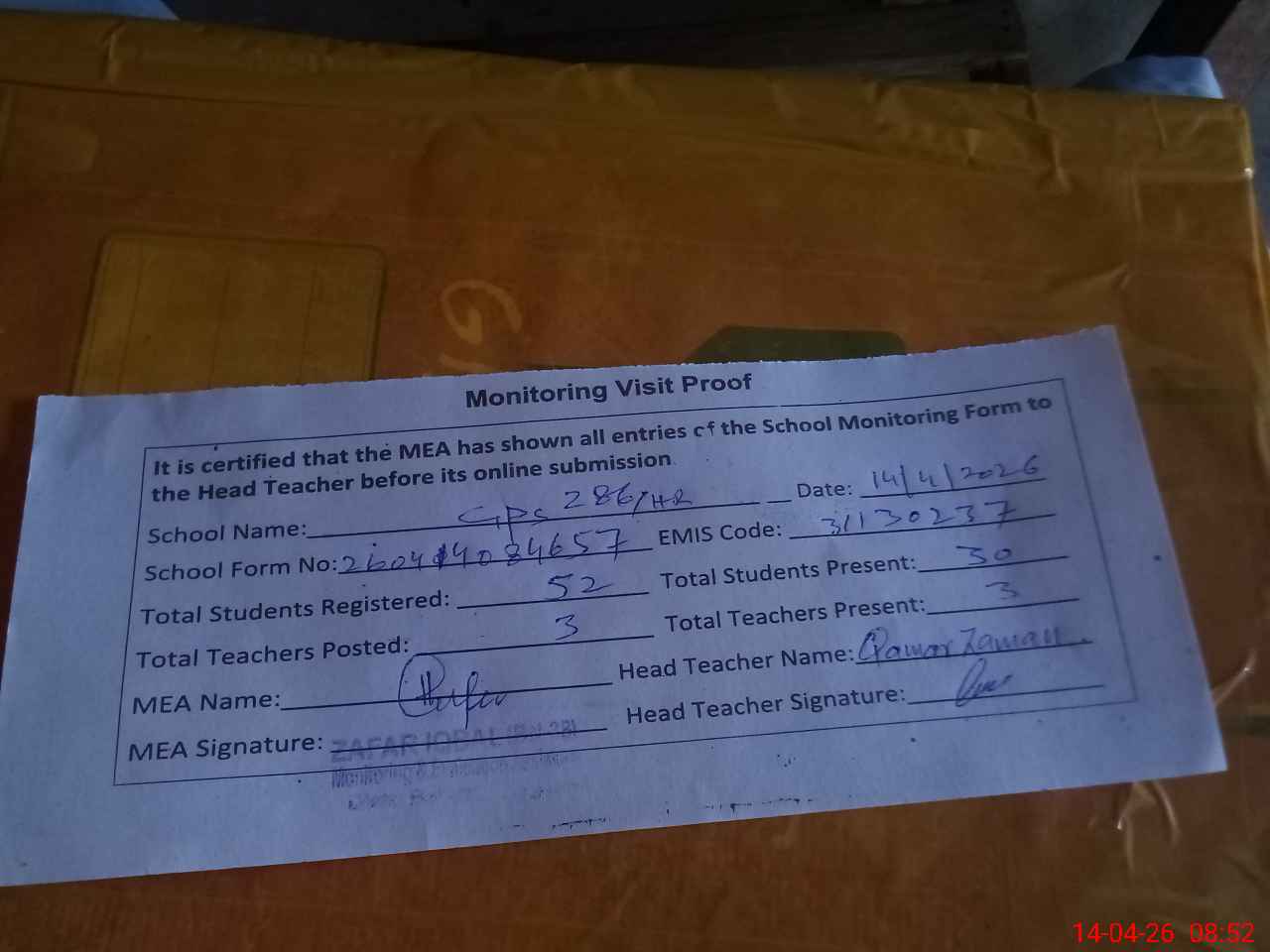 | Attendance Register | Head Teacher | MEA with School | Visit Proof |