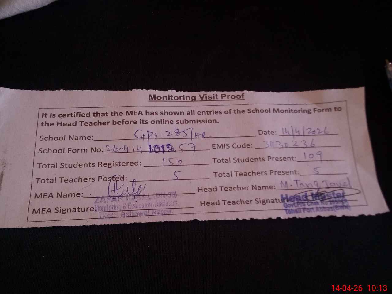 | Attendance Register | Head Teacher | MEA with School | Visit Proof |