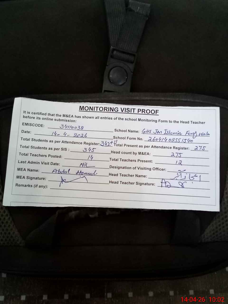 | EMIS Code: 34110038 | Name of School: GHS JM ISLAMIA FEROZ WALA | |||