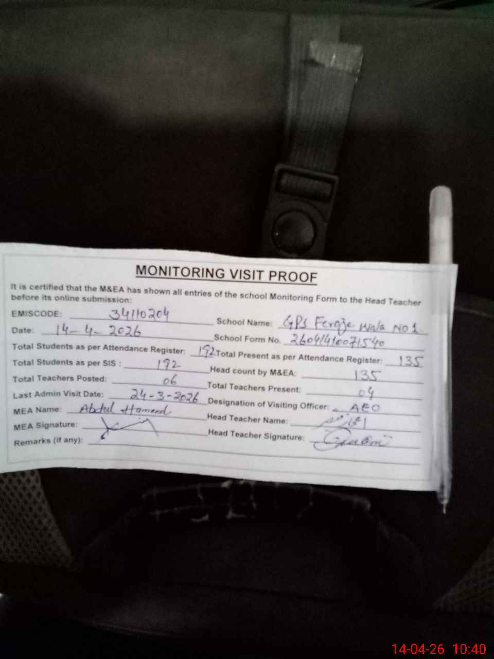| EMIS Code: 34110204 | Name of School: GPS FEROZE WALA NO.1 | |||