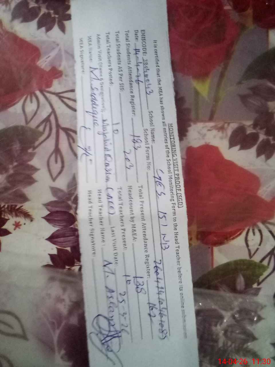 | Attendance Register | Head Teacher | MEA with School | Visit Proof |