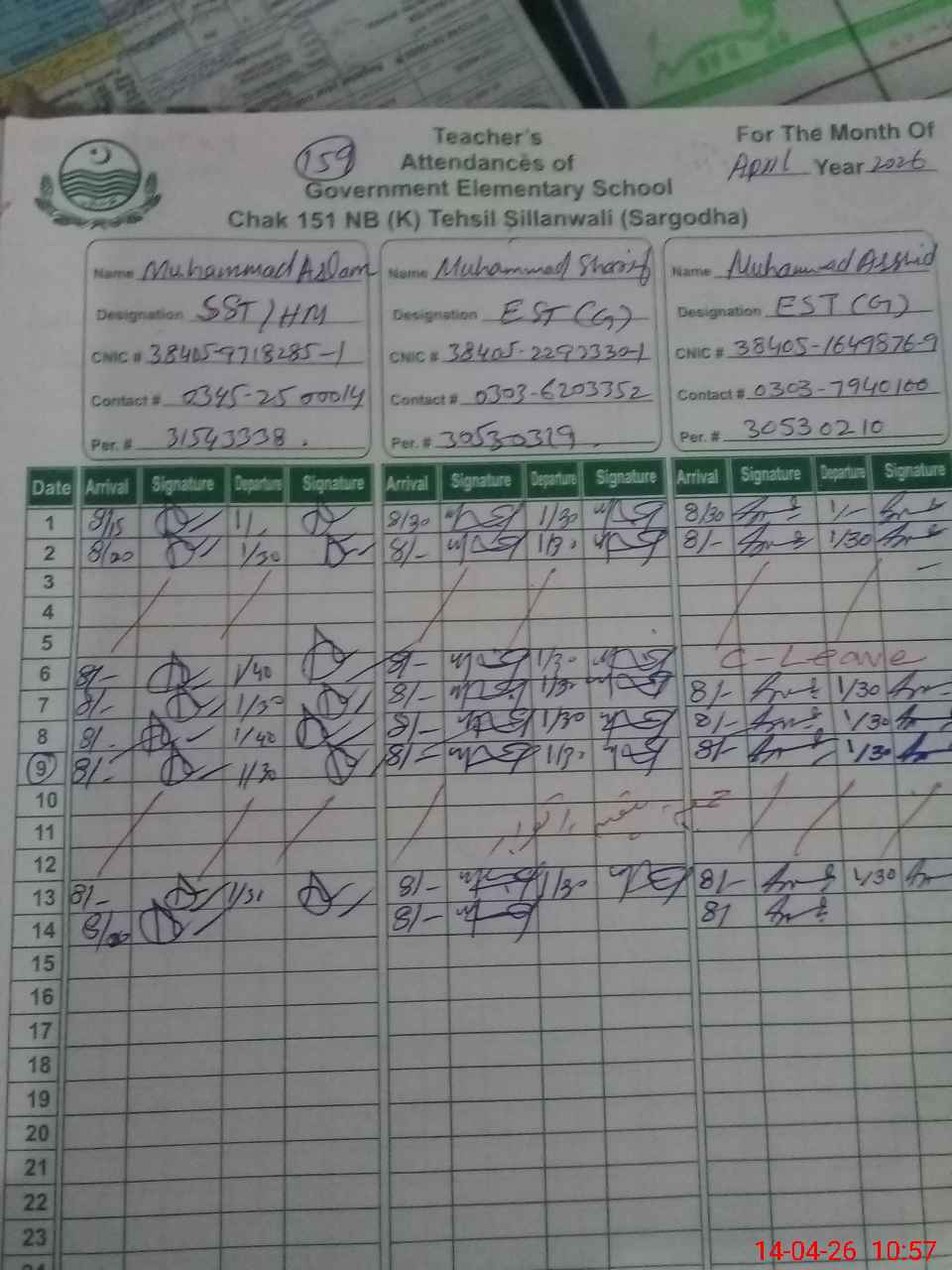 | CNIC | Full Name | Designation | R/C | Absence During Last Calender Month |