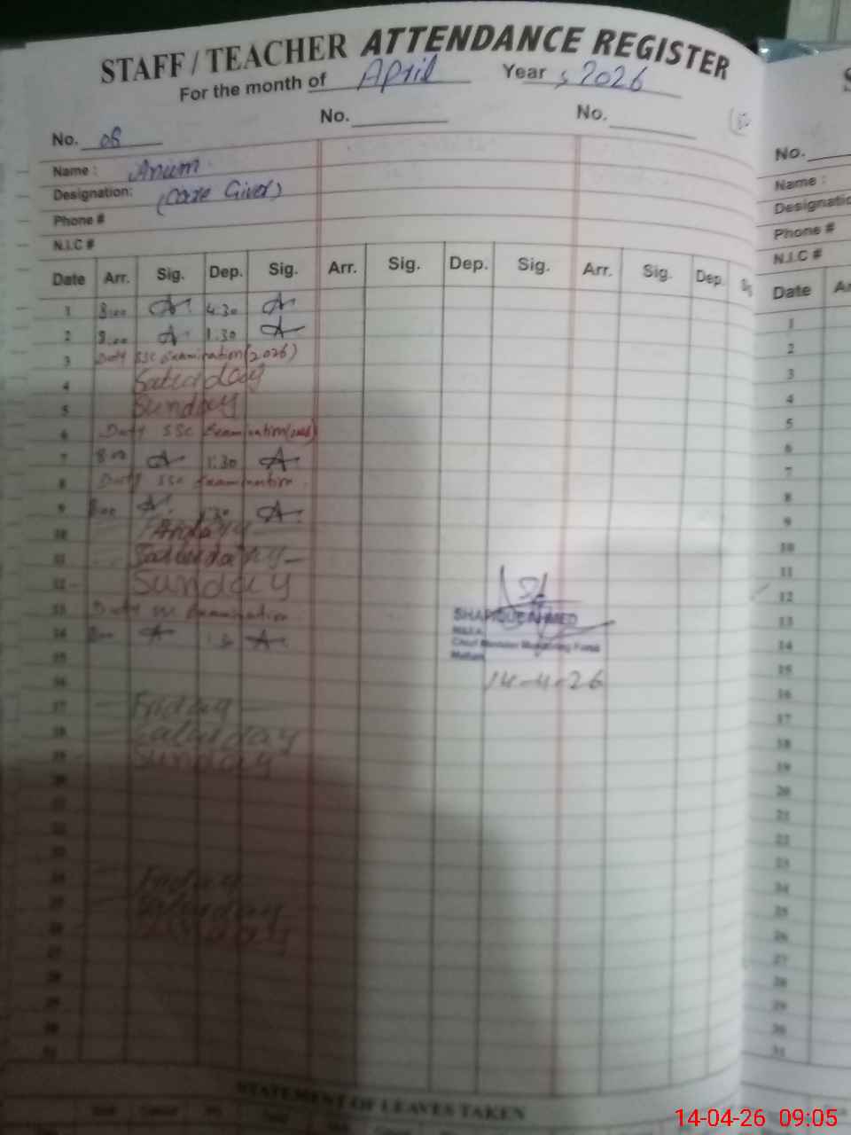 | CNIC | Full Name | Designation | R/C | Absence During Last Calender Month |