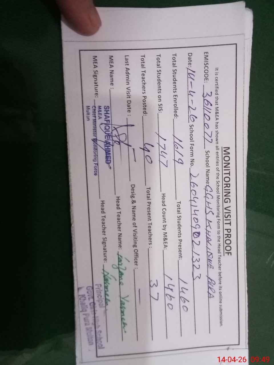 | Certified that this School was Inspected by the Undersigned MEA/DMO Today and the Information Stated Above is as Per Record. | |||||