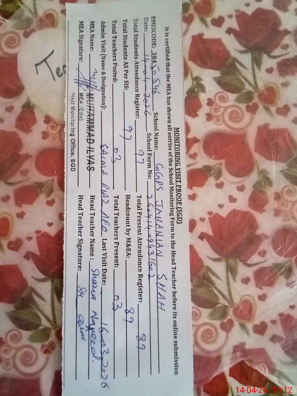 | EMIS Code: 38450546 | Name of School: GGPS JAHANIAN SHAH | |||