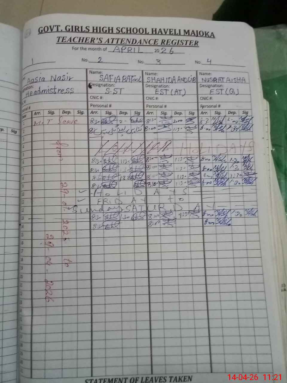 | 38**** | Aa**** Na**** | Headmaster (Urdu) | Regular | 31 | 0 | 0 | 31 | 0 | 0 | 0 | 0 | 0 | Maternity |