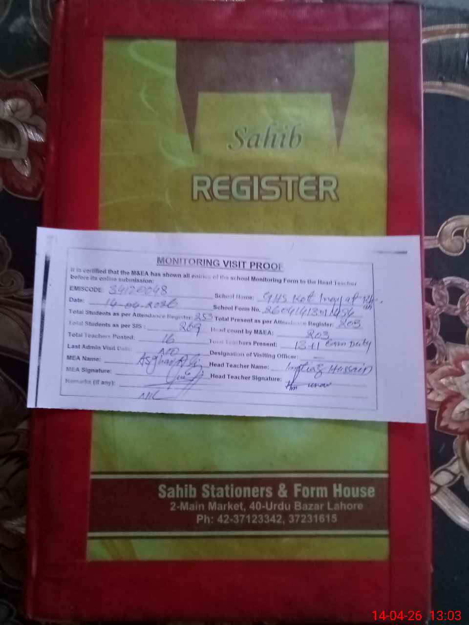 | Attendance Register | Head Teacher | MEA with School | Visit Proof |