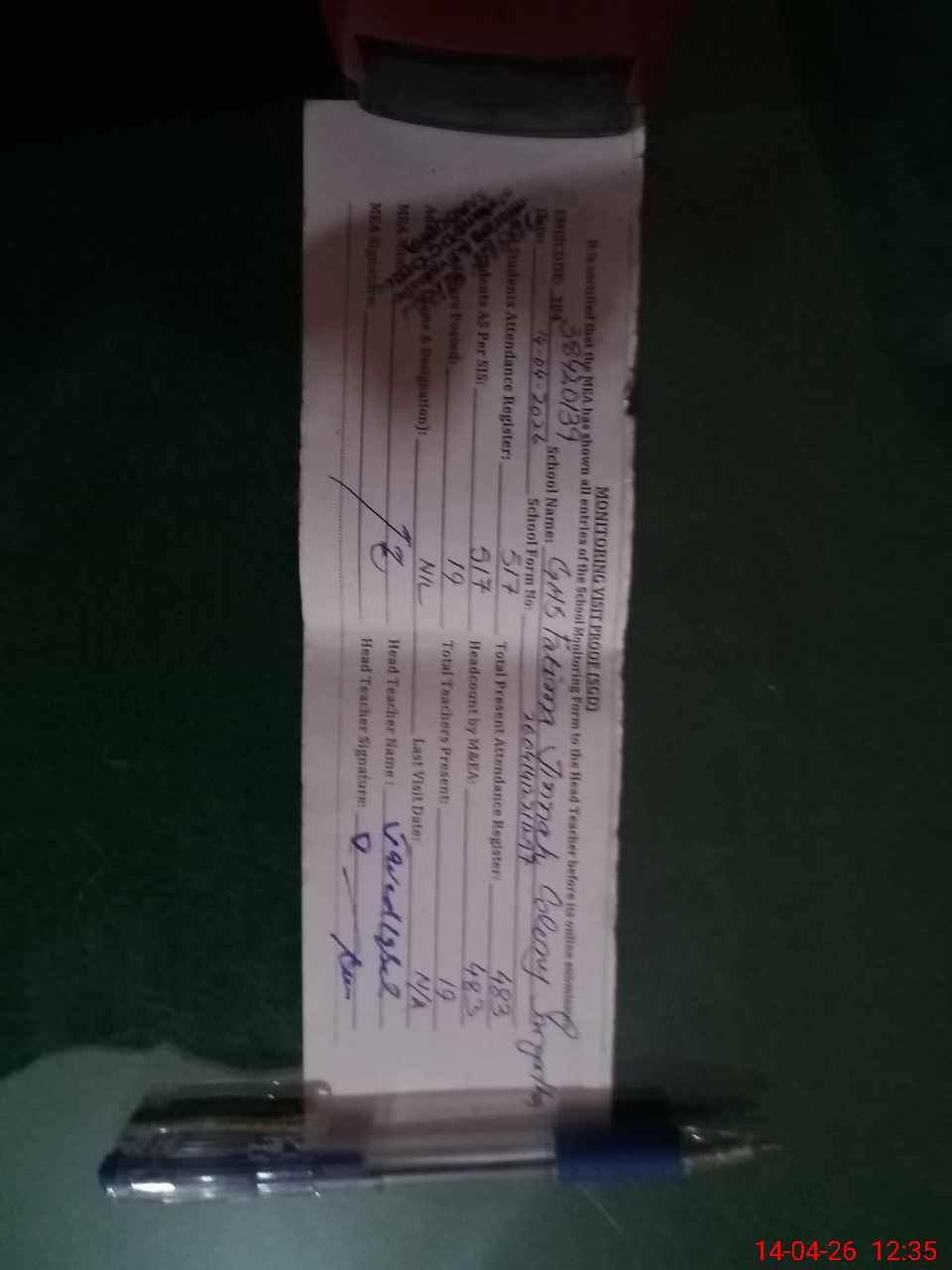 | Attendance Register | Head Teacher | MEA with School | Visit Proof |