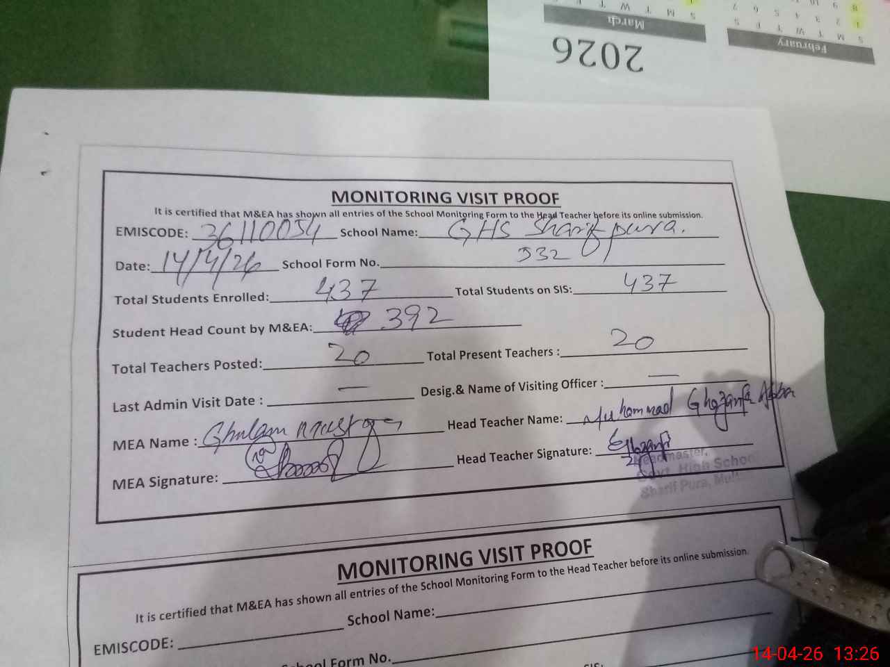 | Attendance Register | Head Teacher | MEA with School | Visit Proof |