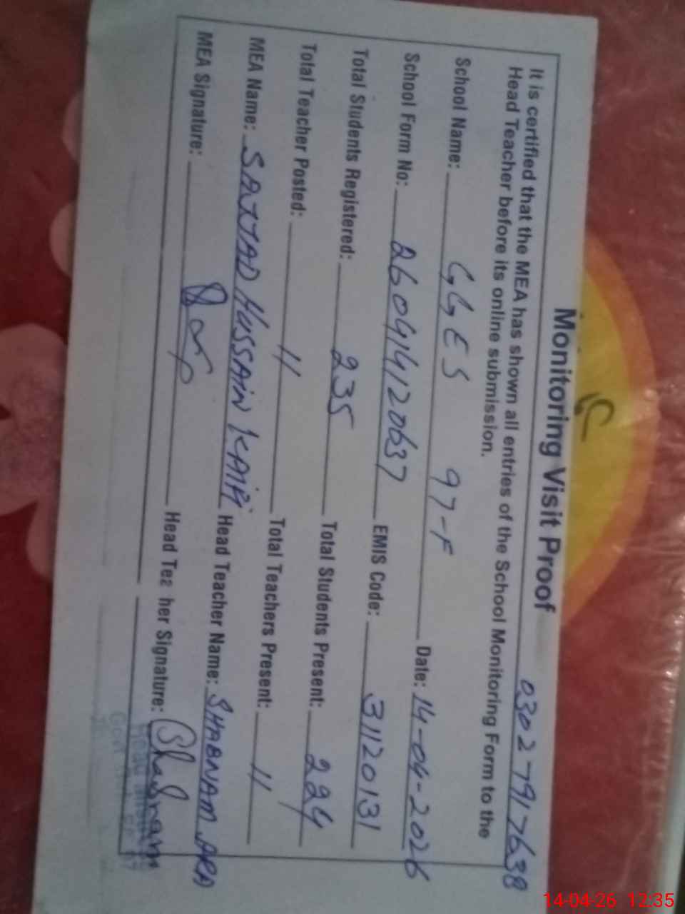 | Attendance Register | Head Teacher | MEA with School | Visit Proof |