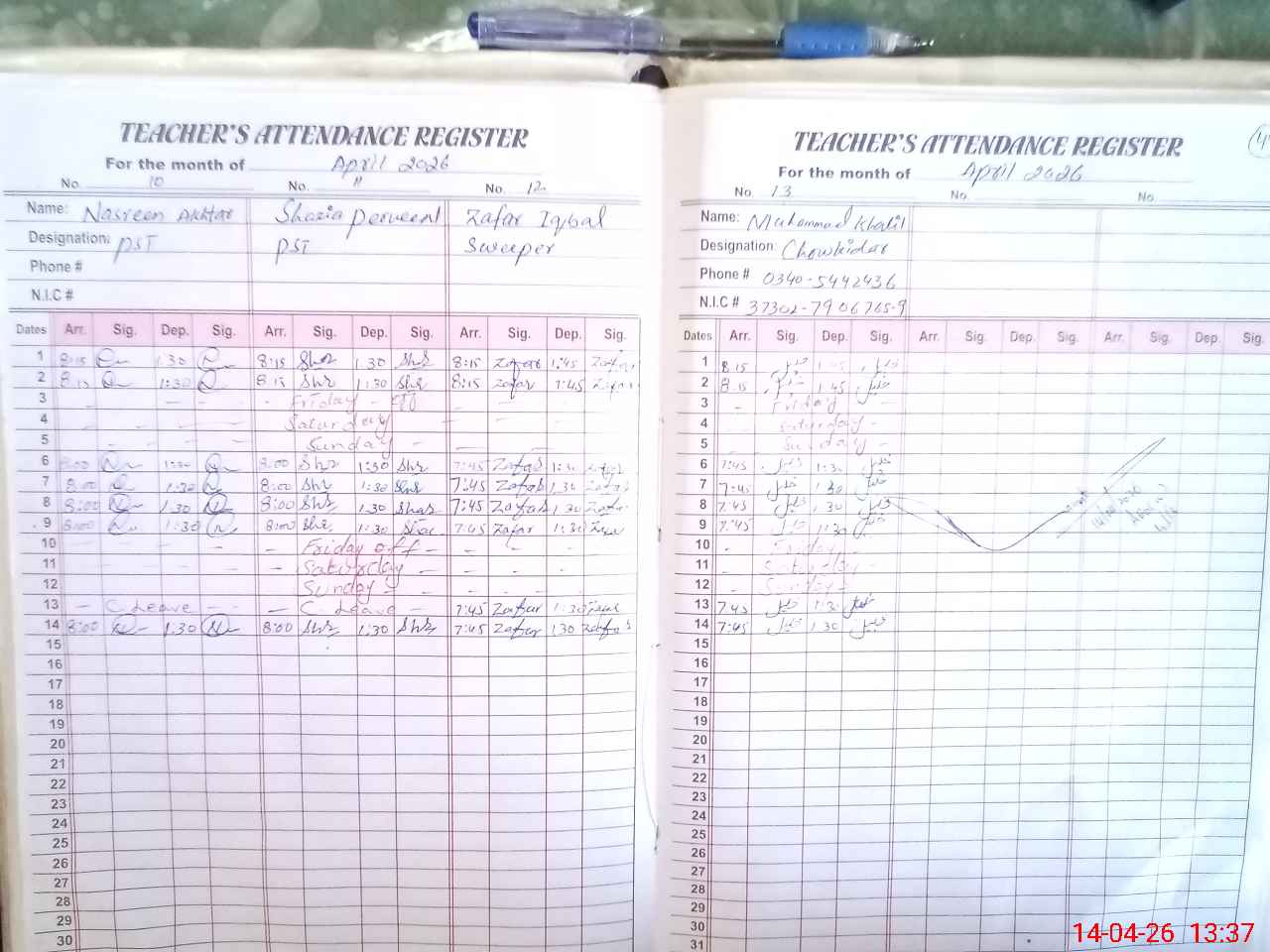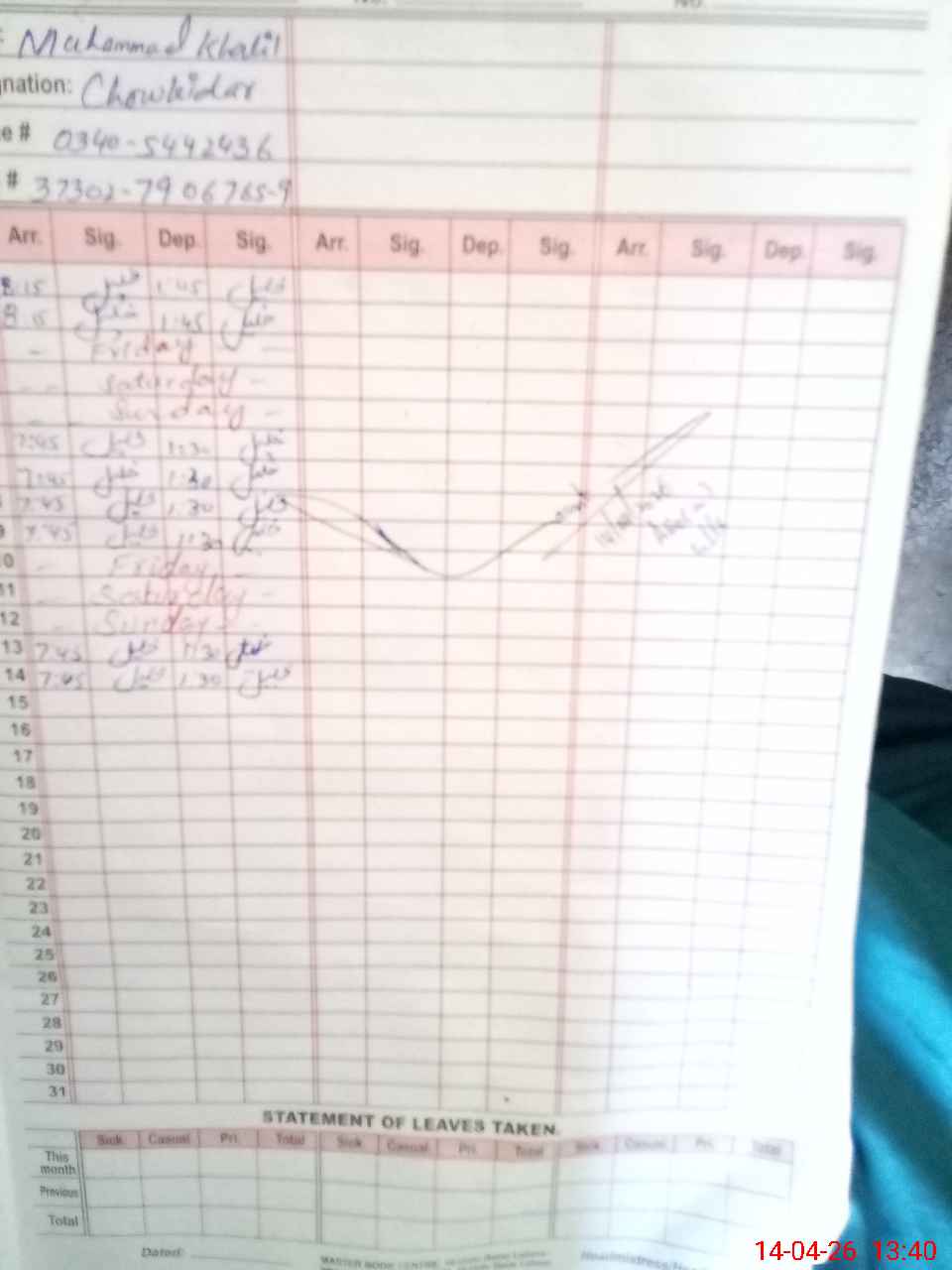 | CNIC | Full Name | Designation | R/C | Absence During Last Calender Month |