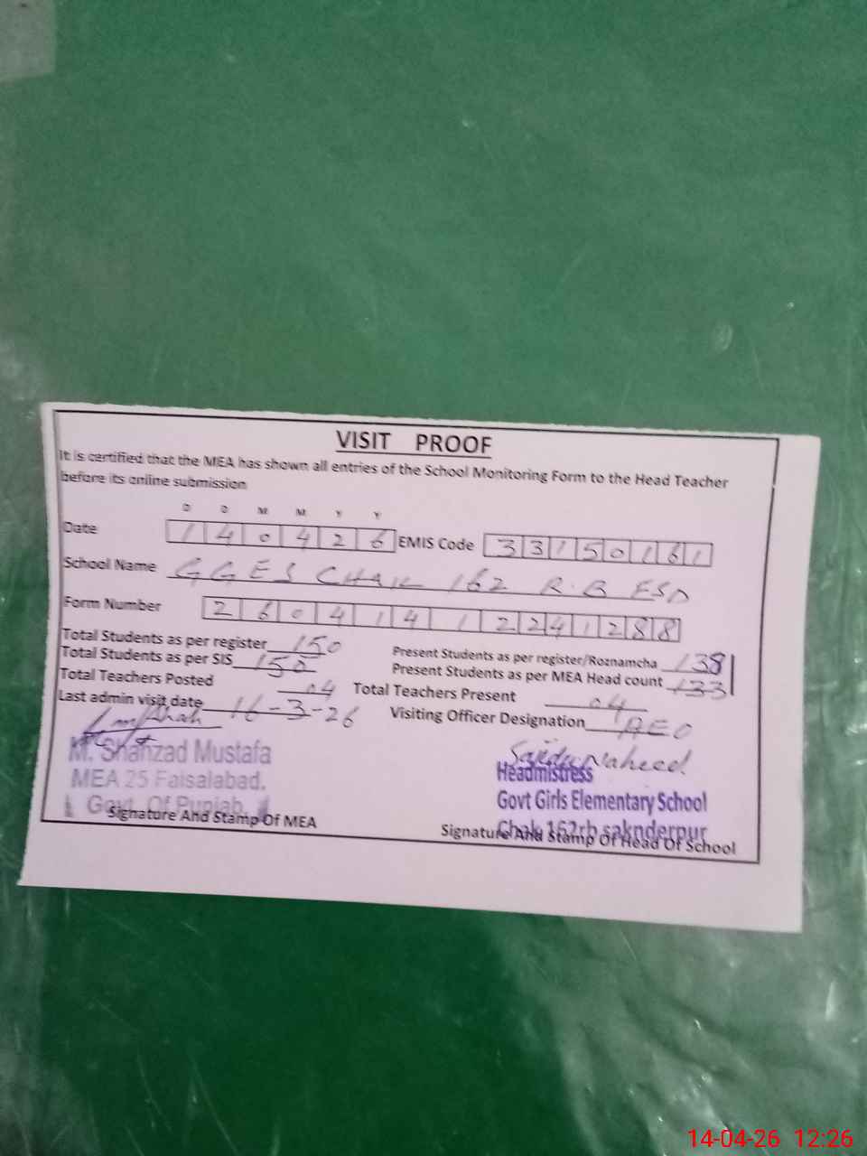 | EMIS Code: 33150161 | Name of School: GGES CHAK 162 RB | |||