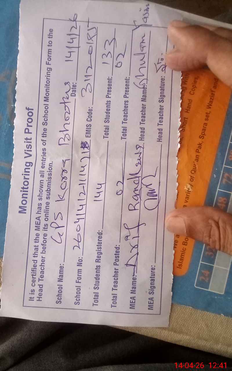| Attendance Register | Head Teacher | MEA with School | Visit Proof |