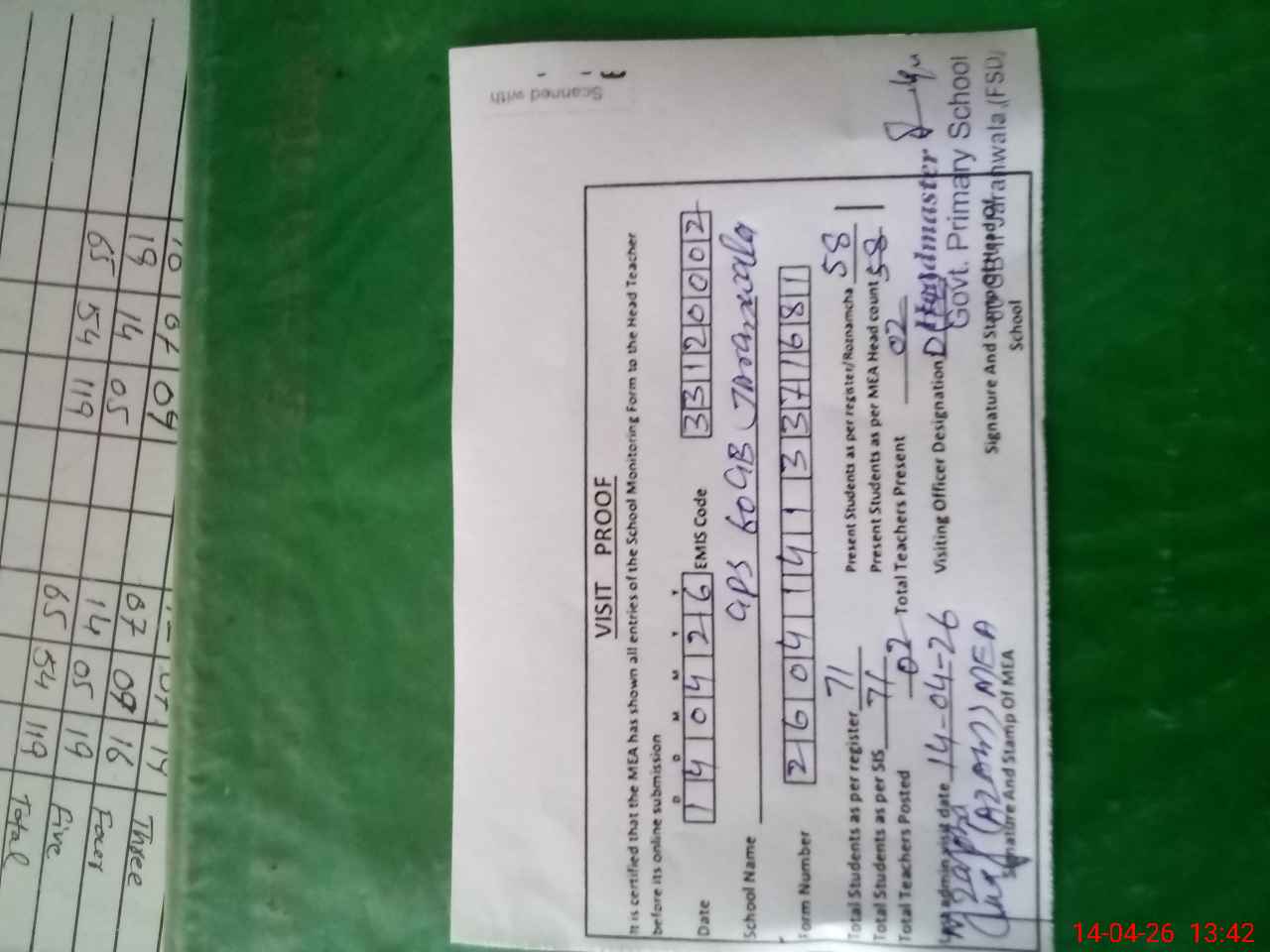 | Attendance Register | Head Teacher | MEA with School | Visit Proof |