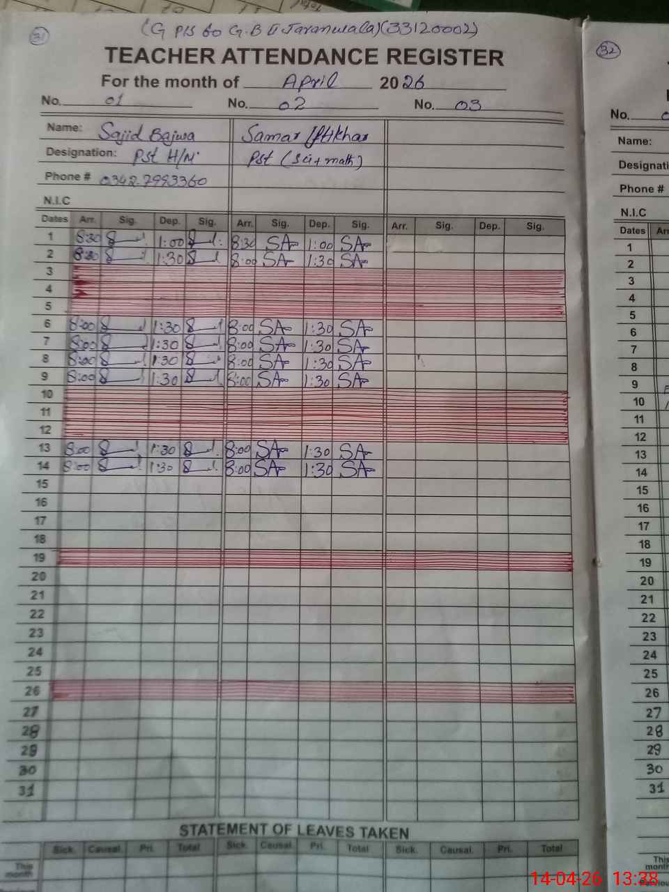 | Name: SA**** RA**** BA**** Designation: (School Headmaster's/Headmistress's) PST Phone/Cell Number: 03**** |