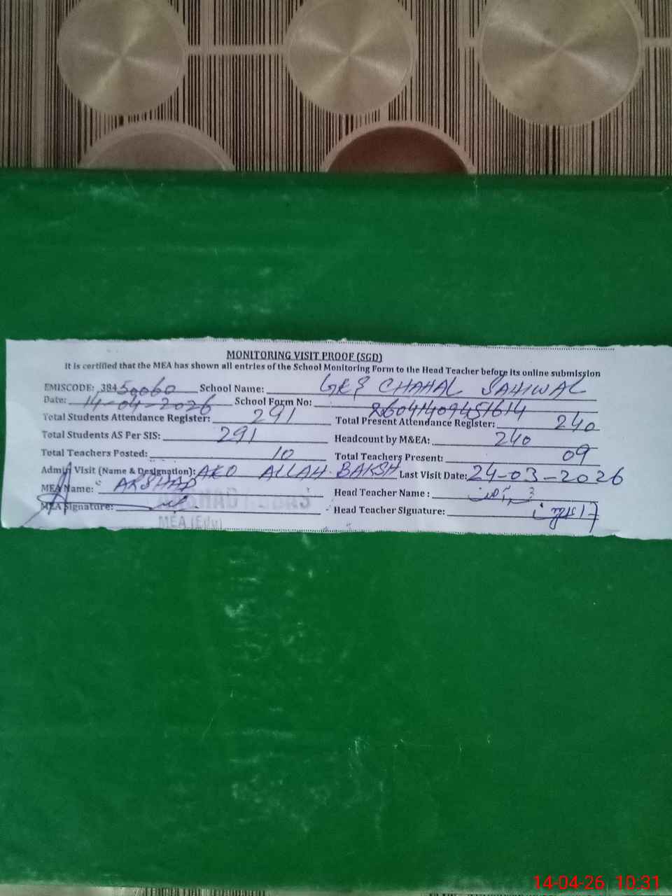 | Attendance Register | Head Teacher | MEA with School | Visit Proof |
