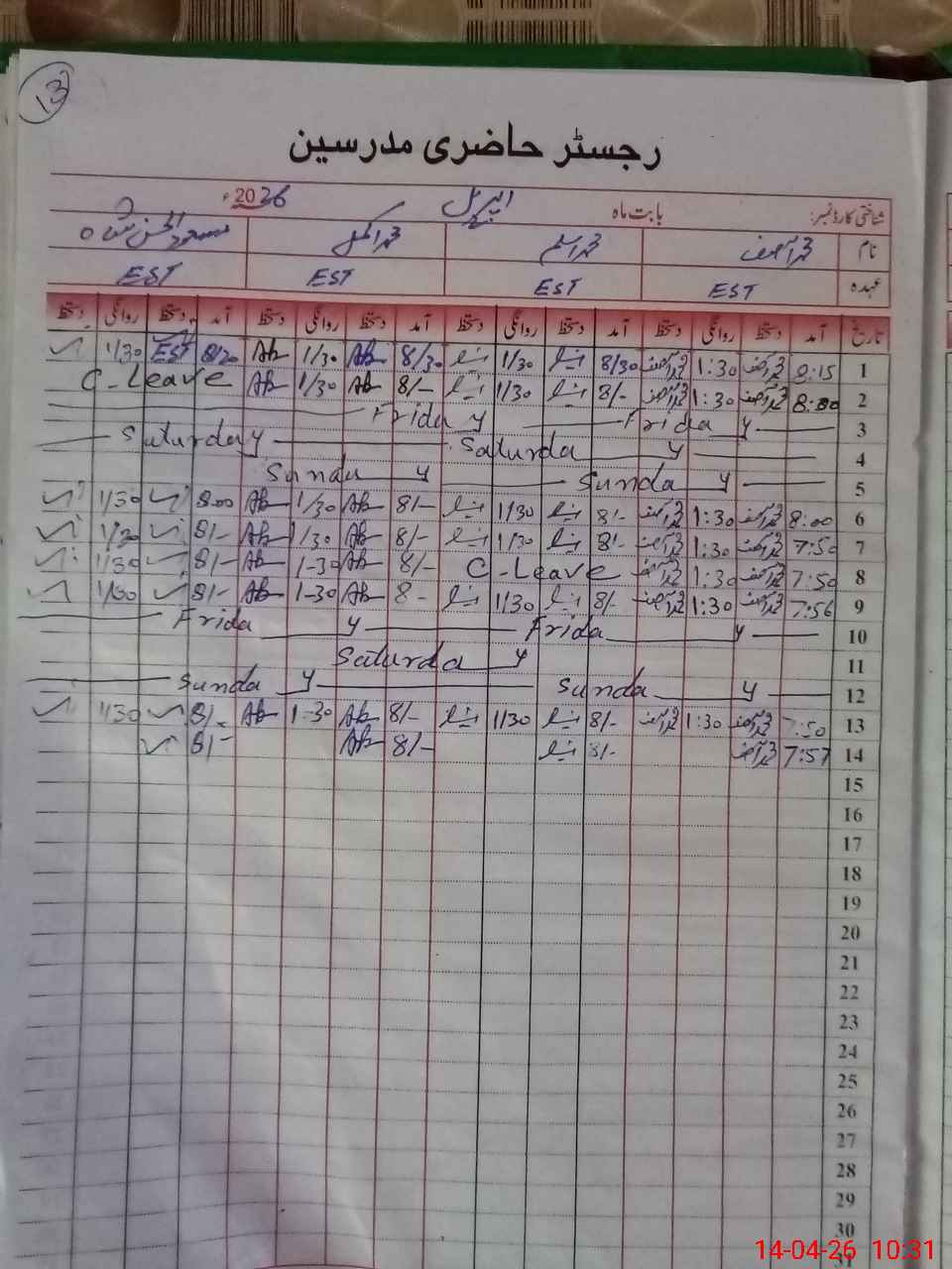 | CNIC | Full Name | Designation | R/C | Absence During Last Calender Month |