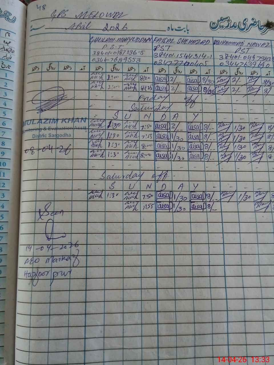 | CNIC | Full Name | Designation | R/C | Absence During Last Calender Month |