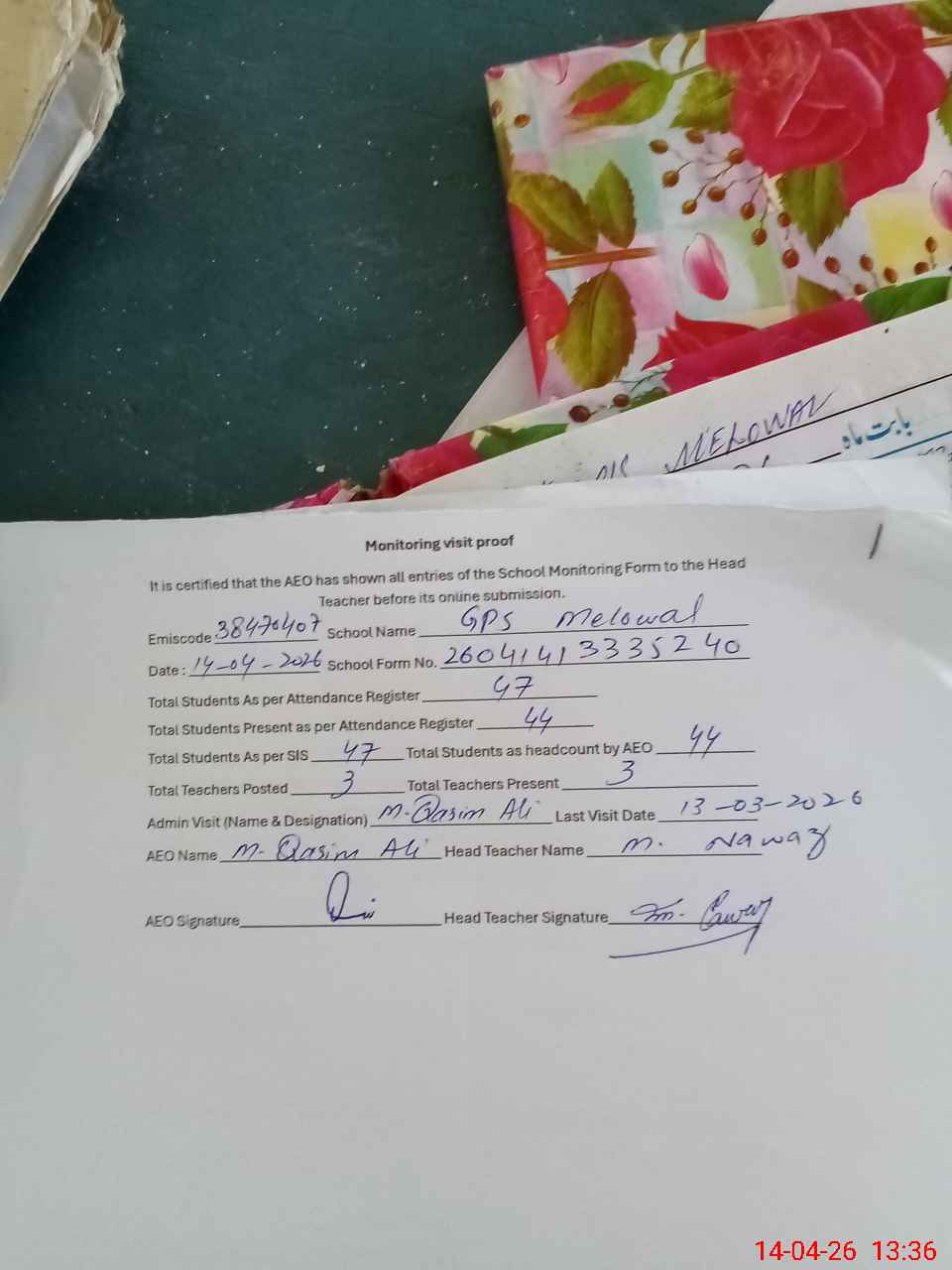 | Attendance Register | Head Teacher | MEA with School | Visit Proof |