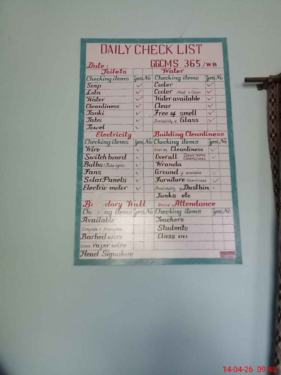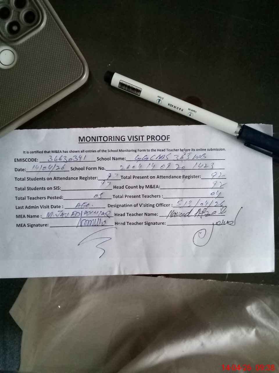| Attendance Register | Head Teacher | MEA with School | Visit Proof |