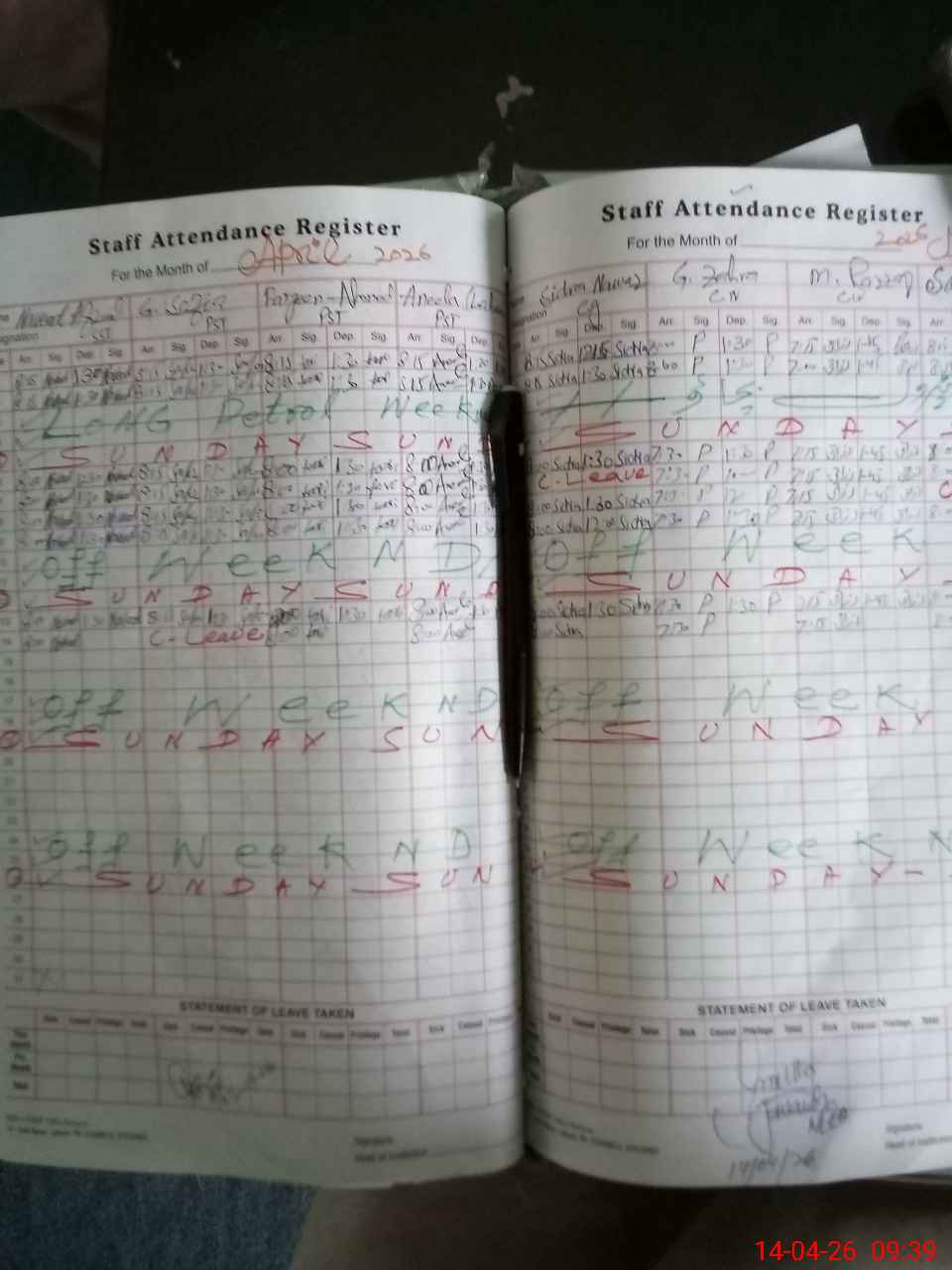 | Leave | Duty | Absent | Maternity | Medical | Ex- Pak |