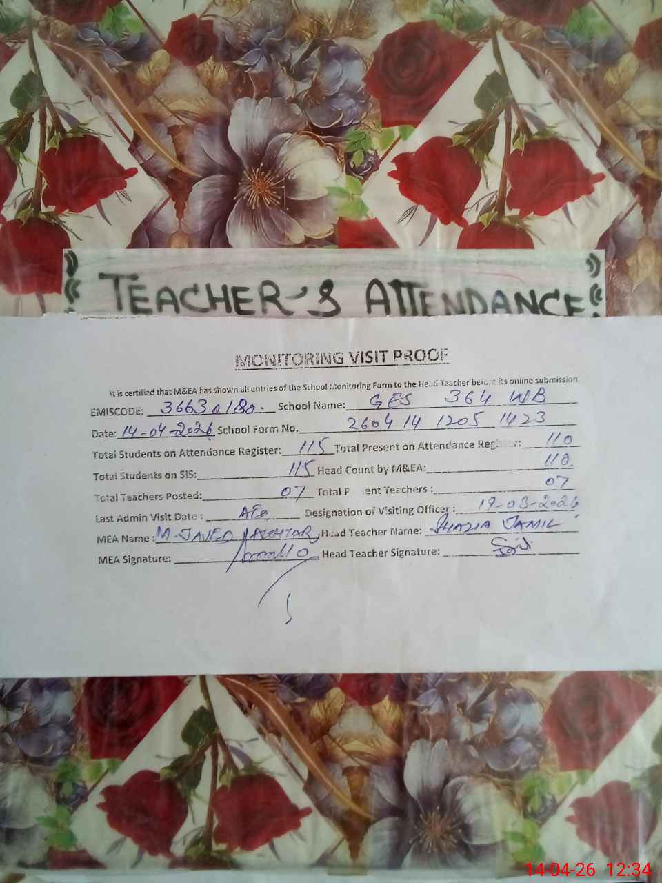 | Attendance Register | Head Teacher | MEA with School | Visit Proof |