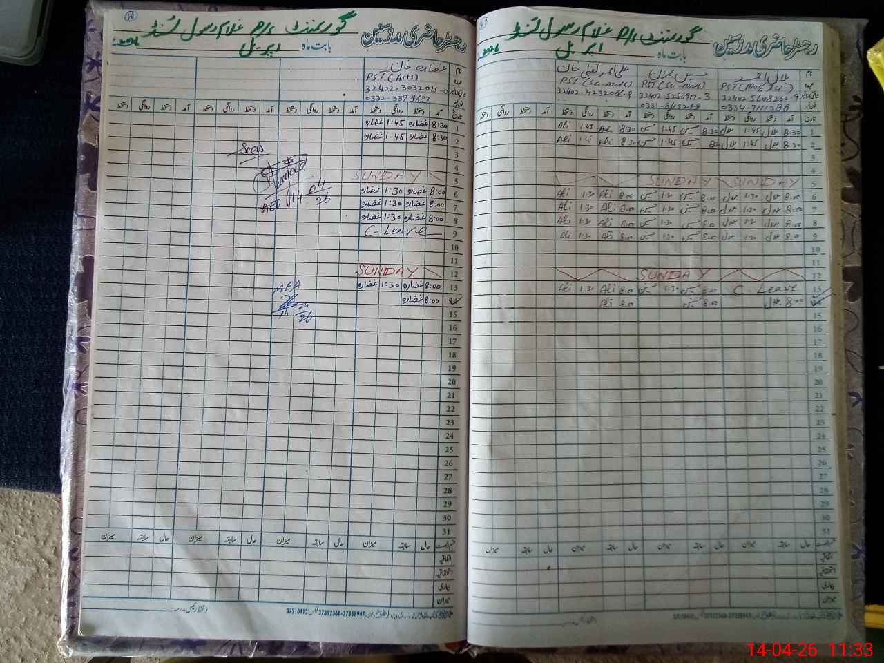 | CNIC | Full Name | Designation | R/C | Absence During Last Calender Month |
