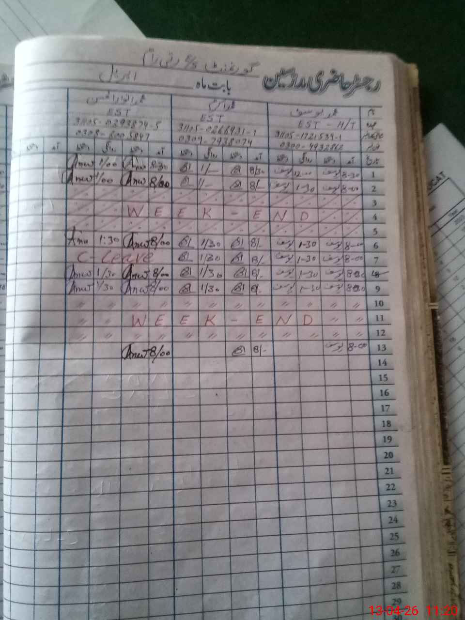| CNIC | Full Name | Designation | R/C | Absence During Last Calender Month |
