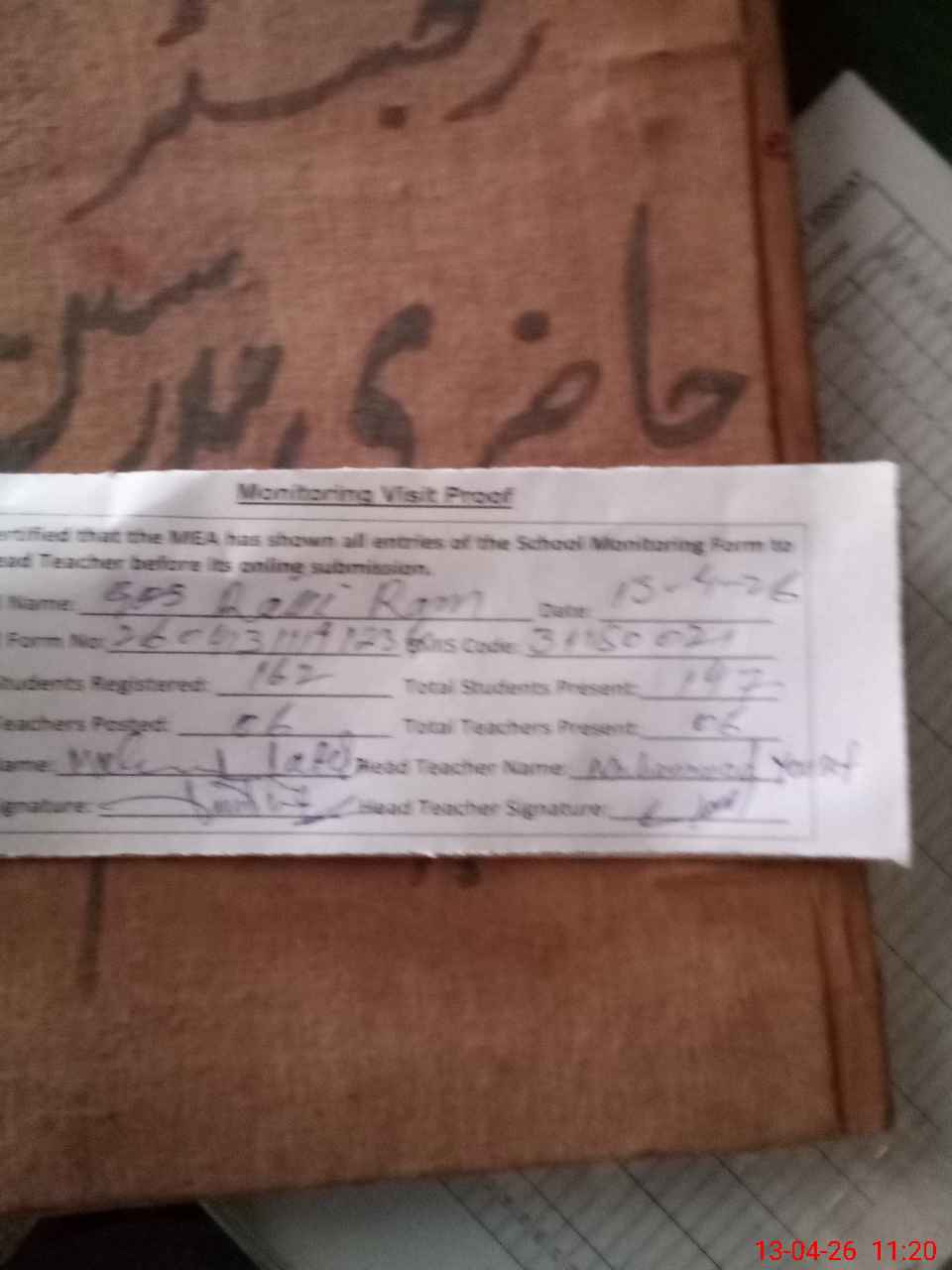 | Attendance Register | Head Teacher | MEA with School | Visit Proof |