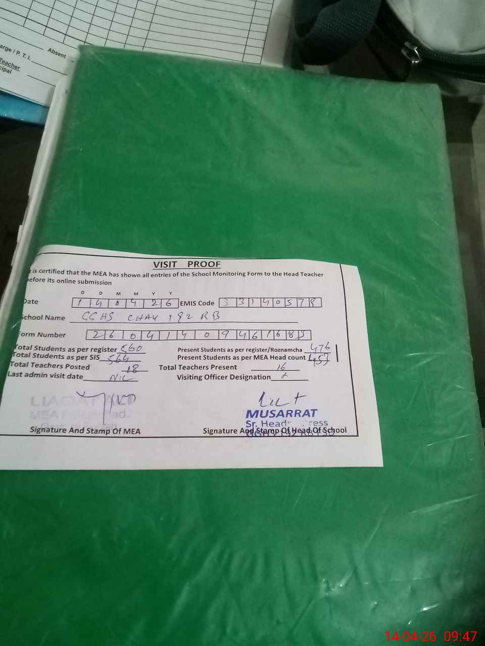 | Attendance Register | Head Teacher | MEA with School | Visit Proof |