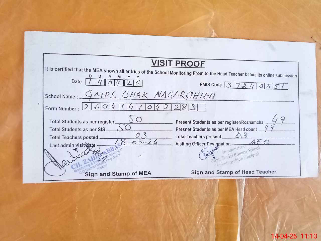 | Attendance Register | Head Teacher | MEA with School | Visit Proof |