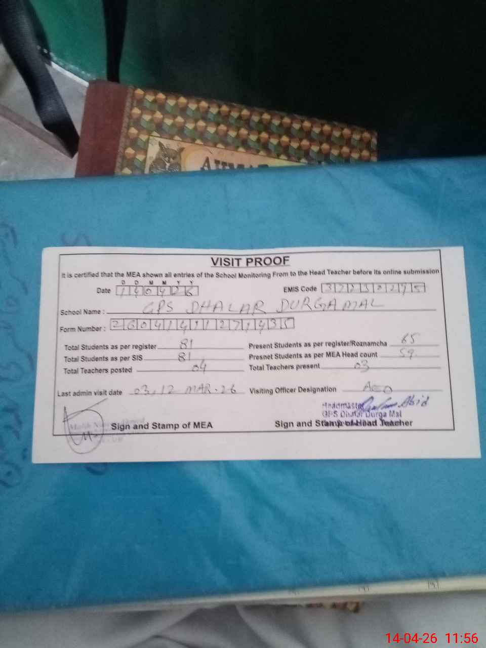 | EMIS Code: 37230295 | Name of School: GPS DHALAR DURGA MAL | |||