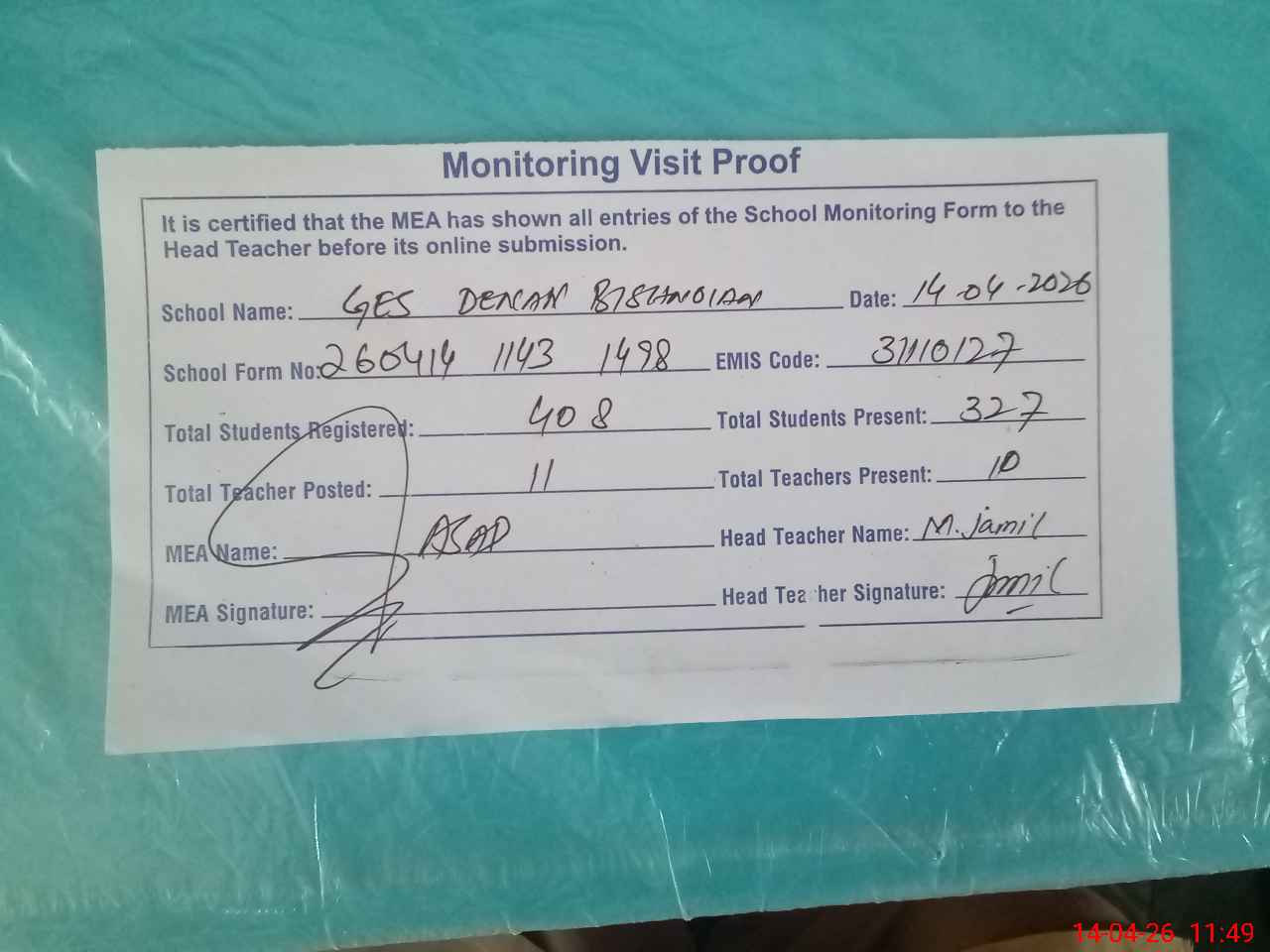 | Attendance Register | Head Teacher | MEA with School | Visit Proof |