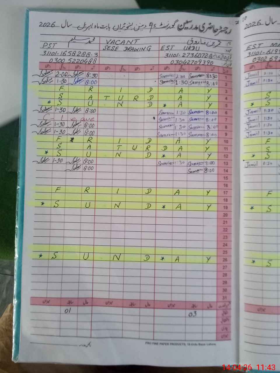 | CNIC | Full Name | Designation | R/C | Absence During Last Calender Month |