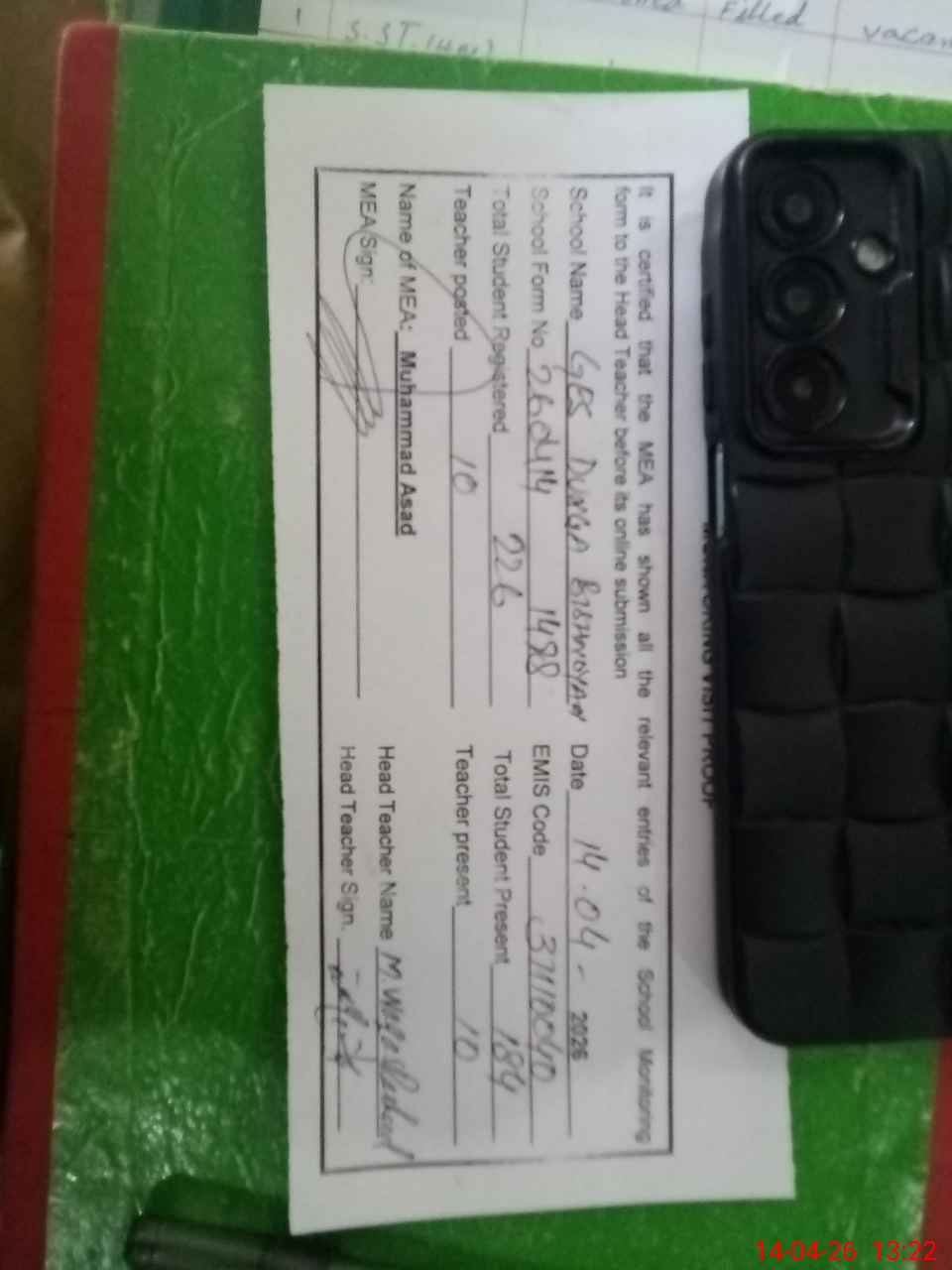 | Attendance Register | Head Teacher | MEA with School | Visit Proof |