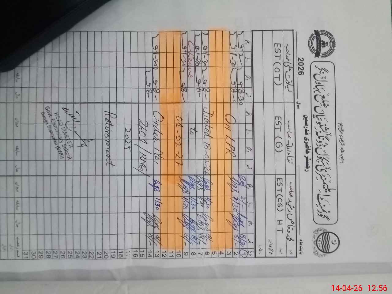 | CNIC | Full Name | Designation | R/C | Absence During Last Calender Month |