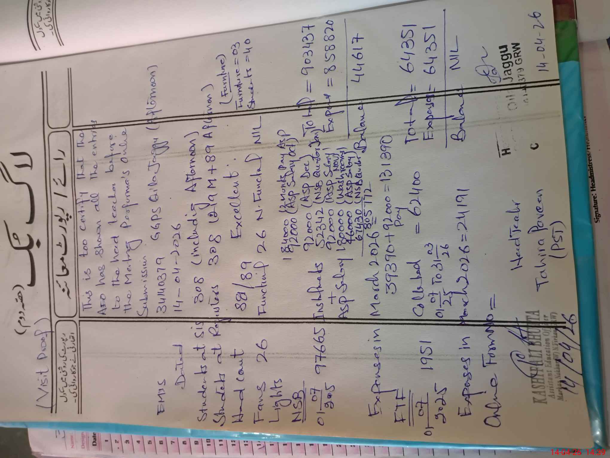 | Attendance Register | Head Teacher | MEA with School | Visit Proof |