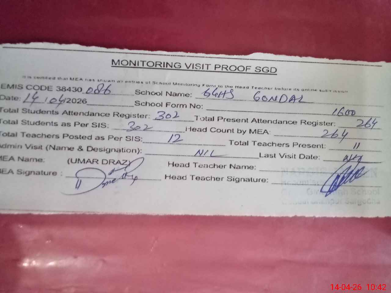 | Attendance Register | Head Teacher | MEA with School | Visit Proof |