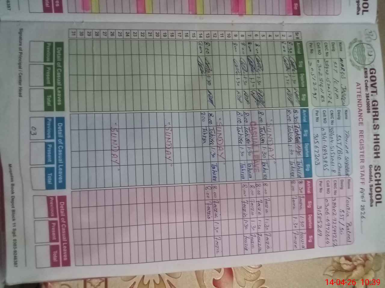 | CNIC | Full Name | Designation | R/C | Absence During Last Calender Month |
