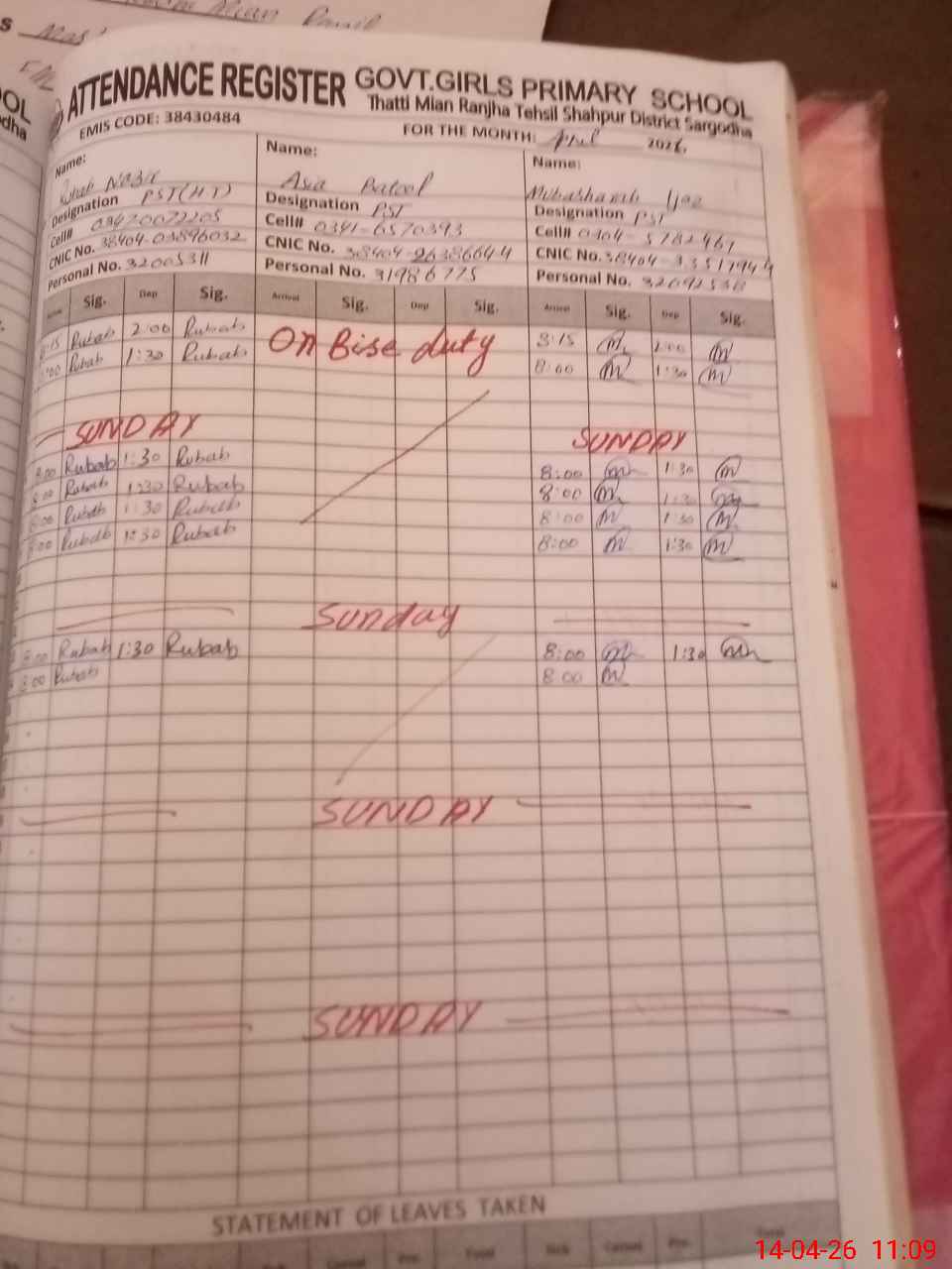 | 38**** | As**** Ba**** | PST Science/Maths | Regular | 0 | 0 | 0 | 0 | 0 | 0 | 0 | 0 | 0 | Exam Duty |