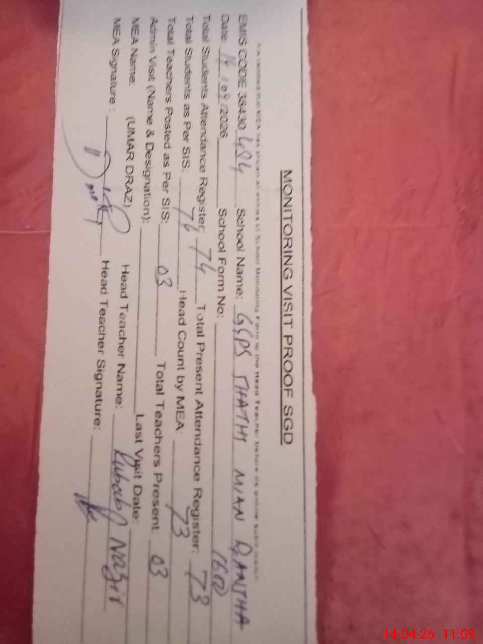 | Attendance Register | Head Teacher | MEA with School | Visit Proof |
