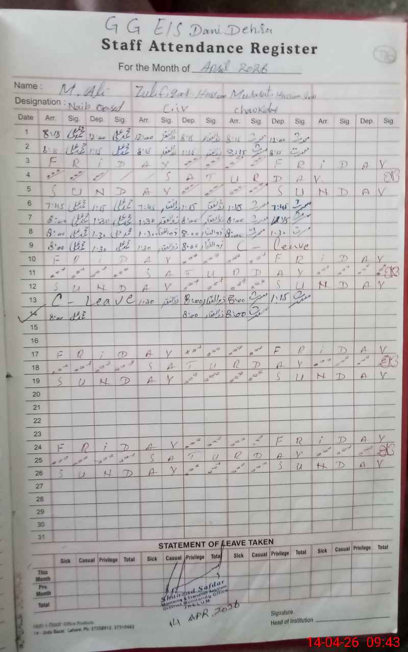 | CNIC | Full Name | Designation | R/C | Absence During Last Calender Month |