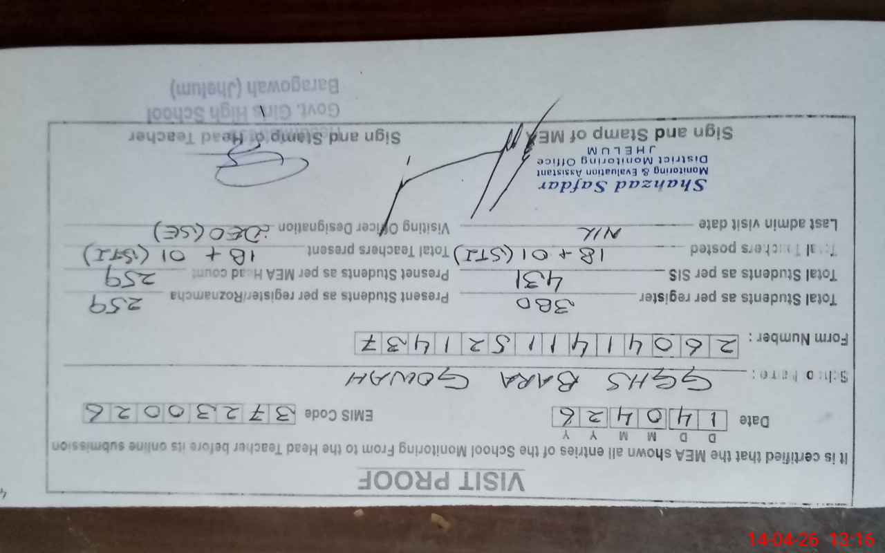 | EMIS Code: 37230026 | Name of School: GGHS BARA GOWAH | |||