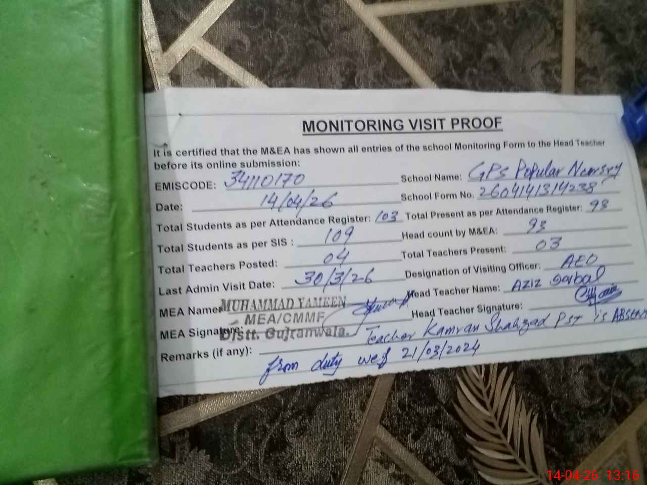 | Attendance Register | Head Teacher | MEA with School | Visit Proof |