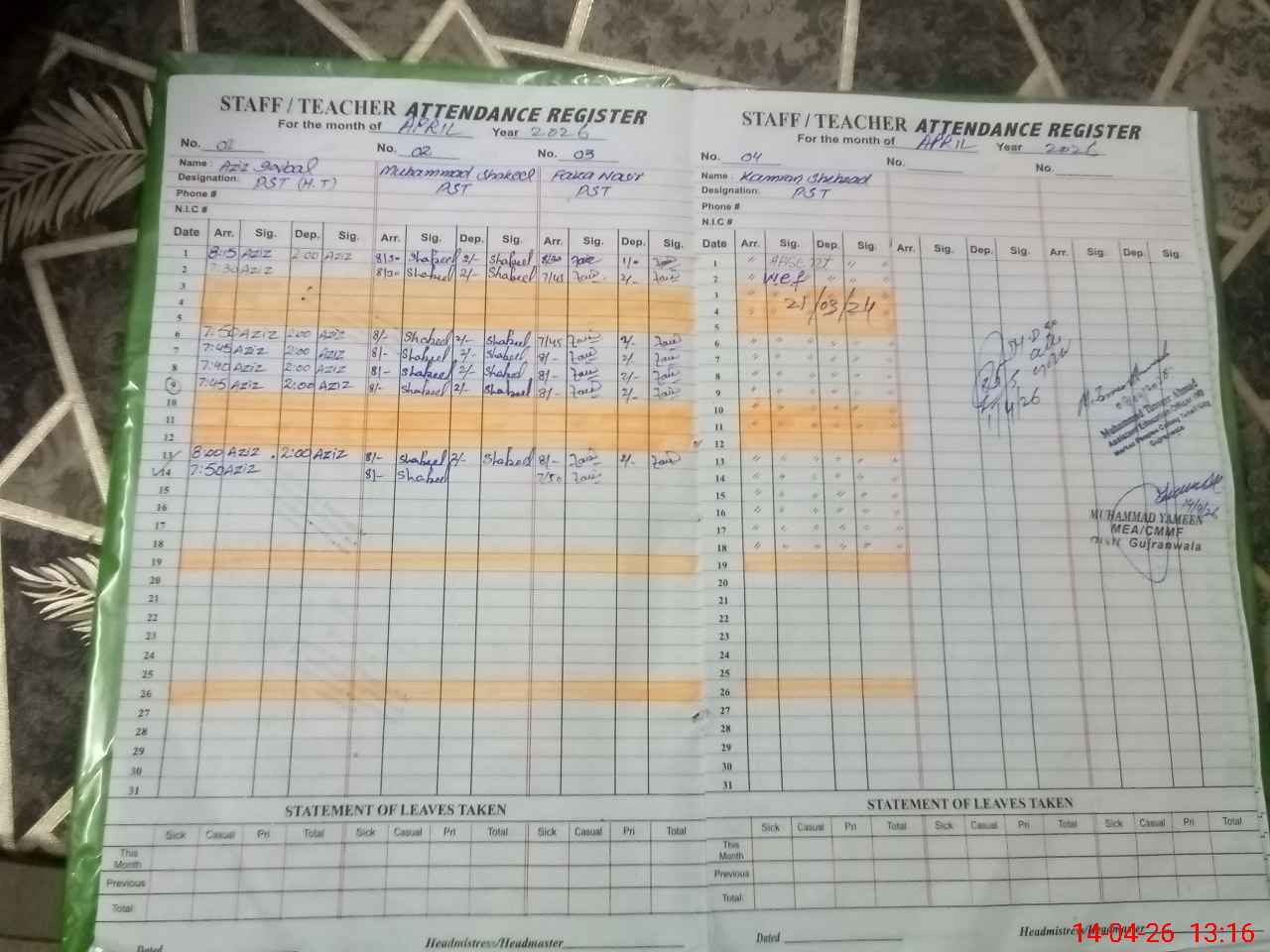 | Name: AZ**** IQ**** Designation: (School Headmaster's/Headmistress's) PST Phone/Cell Number: 03**** |